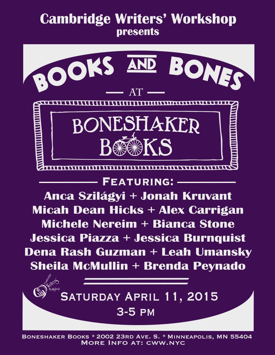 AWPReading2015Poster (1) Published March 23, 2015 at 2550 × 3300 in Cambridge Writers’ Workshop is coming to AWP 2015 in Minneapolis, Minnesota! ← Previous Our annual AWP reading this year was “Books and Bones at Boneshaker Books.”