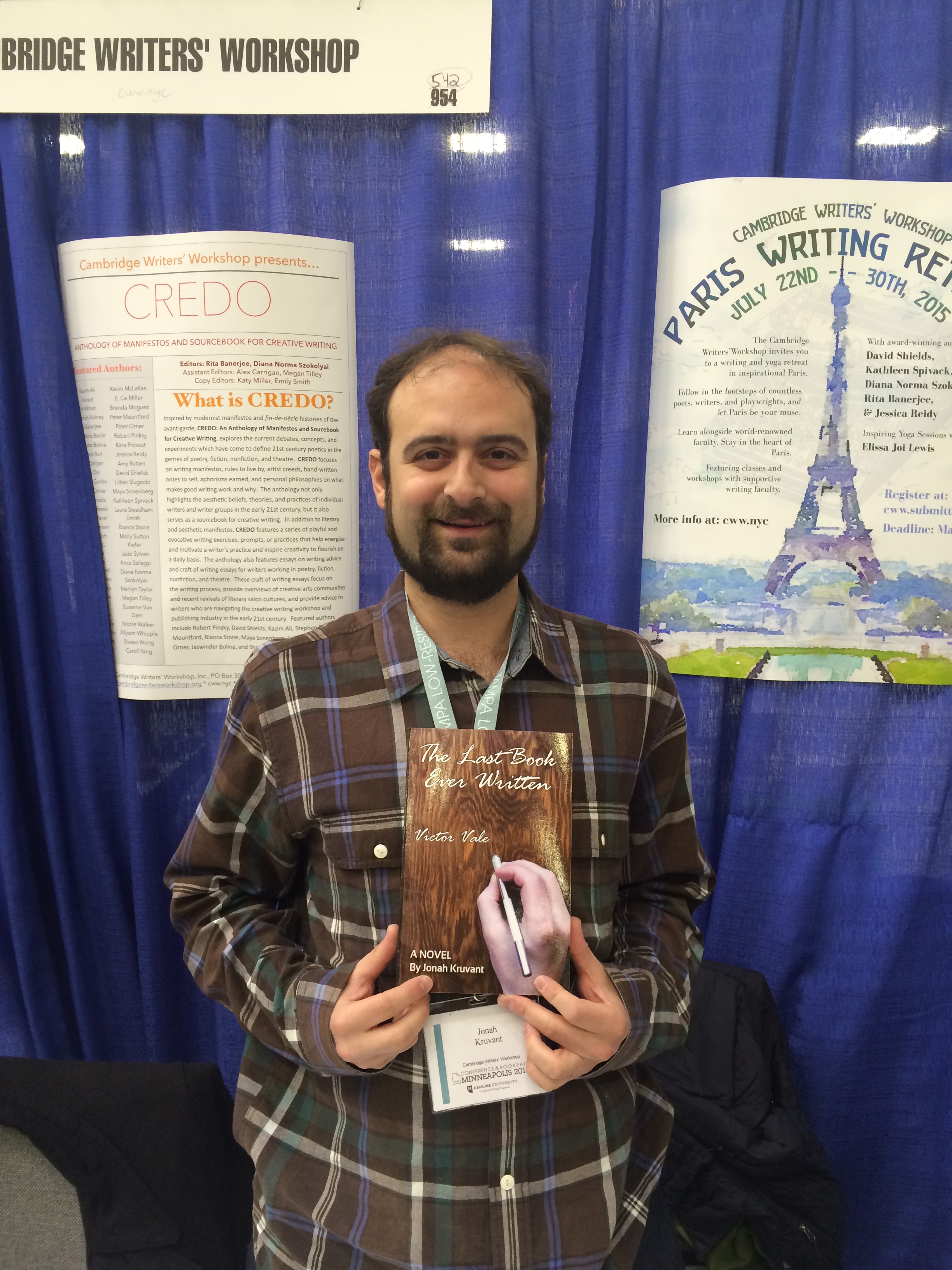 IMG_0936 Published April 12, 2015 at 2448 × 3264 in Cambridge Writers’ Workshop at AWP 2015 Recap! ← Previous Next → CWW Exec Board Member Jonah Kruvant sold and autographed his new book, “The Last Book Ever Written,” at our table during the conference.