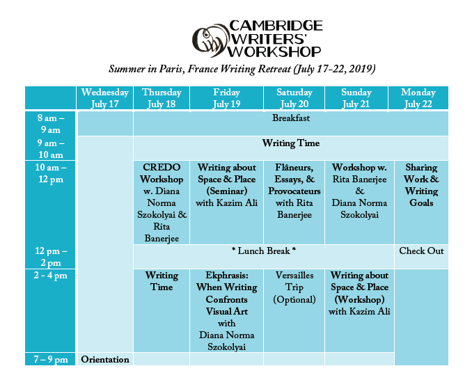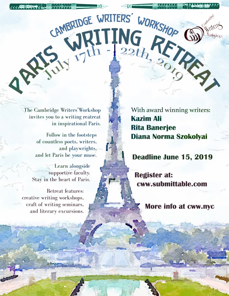 The Cambridge Writers’ Workshop Summer in Paris Writing Retreat will take place from July 17-22, 2019. Situated in heart of Paris’ Montparnasse neighborhood, amongst the fresh and popular open air markets and charming boutiques, the hotel stay is full of Parisian charm and our classes will take place in a beautiful Moroccan themed room that opens to a courtyard that can also be used by our writers. Retreat activities will include craft of writing seminars and creative writing workshops, literary tours of Paris. If you’re serious about writing and want to soak in some exquisite French culture this summer, join our retreat in Paris! The faculty includes award-winning writers Kazim Ali,Rita Banerjee, and Diana Norma Szokolyai. Genres include poetry, fiction, and nonfiction.