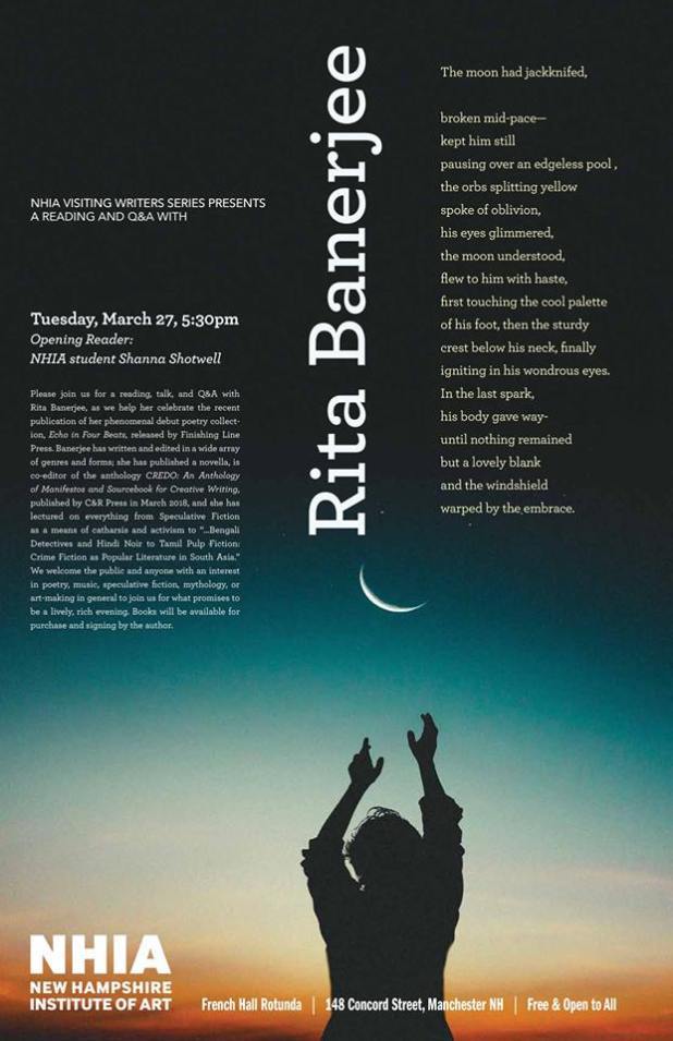 The Cambridge Writers’ Workshop’s Executive Creative Director Rita Banerjee will be a Visiting Writer at the New Hampshire Institute of Art this Spring.  She will be lecturing and giving workshops on topics such as “Rasa: Emotion and Suspense in Theatre, Poetry, and (Non)Fiction,” “Poetry and What’s at Stake,” and “Revising, Pitching, and Publishing” at NHIA on Tuesday, March 27.  In addition, she will be holding a discussion with Ayris editors and staff on Tuesday, March 27.  Rita Banerjee will also be reading from her debut poetry collection Echo in Four Beats at the French Hall Rotunda at NHIA from 5:30-7:30 pm on Tuesday, March 27, 2018.  The poetry reading and Q&A for Echo in Four Beats is free and open to the public.